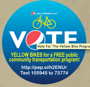 That’s where Pepsi Refresh and you come in. The Yellow Bike Project is now part of Pepsi’s grant program. Your votes could help this amazing organization provide $25,000 worth of bikes to the Branson community. You can vote three times a day.